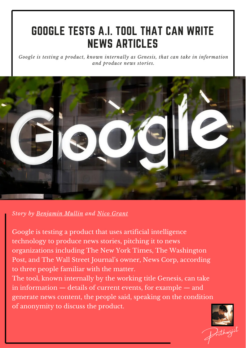 Google Tests A.I. Tool That CAN Write News ArticlesStory by Benjamin Mullin and Nico GrantPrithwijit BoseJan 14, 2024ShareThanks for reading Prithwijit’s Substack! Subscribe for free to receive new posts and support my work.Subscribe